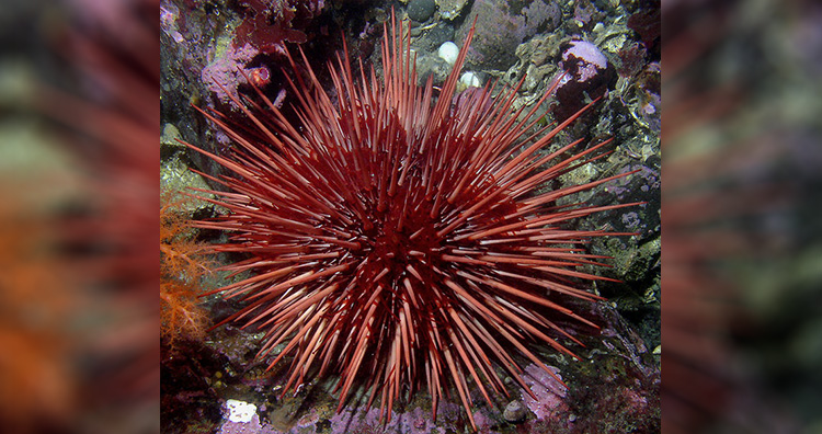 The red sea urchin is a sea animal covered in spines that can live for about 100 to 200 years. They are even thought to be negligibly senescent and seldom die unless they are killed, captured or eaten first. Image credit: Taollan82, Kirt L. Onthank/wikimedia