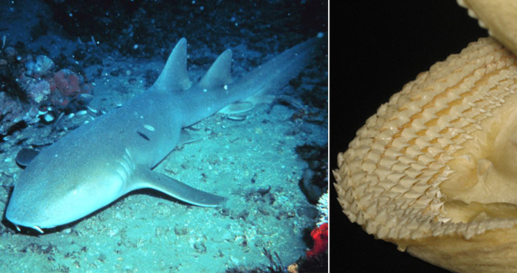 Shark teeth are actually modified placoid scales having the same structure as teeth. They have an outmost layer of enamel, with dentine and central pulp cavity. Most of them have five rows of teeth, which when damaged, is replaced by the ones in the row behind it. The ones in the front are used and are also the largest. The nurse sharkâs teeth in the front row get replaced every ten to 14 days during the summer when it is more energetic, as compared to winter. (1, 2)