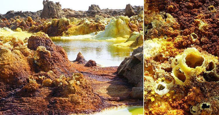 Even under such harsh conditions, the desert is home to a few Afar people, who rely heavily on the salt present in the desert for their livelihood. They mine slabs of salt from the flats surrounding the Danakil Depression. They then load the slabs onto camels and travel miles back to the nearest city to offload and sell their precious cargo. (1,2)