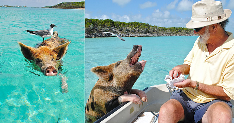Big Major Cay is an uninhabited island. The island is populated by a colony of feral pigs that live on the island and in the surrounding shallows. It is said that the pigs might have been dropped on the island by a group of sailors who wanted to come back and cook them. The sailors never returned and the pigs survived on excess food dumped from passing ships. One legend says that the pigs were survivors of a shipwreck and managed to swim to the island, while another claims that the pigs escaped from a nearby islet. Others suggest that the pigs were part of a business scheme to attract tourists to the Bahamas.