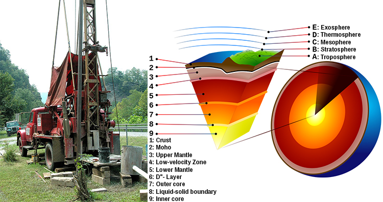 The radius of the Earth is about 6,500 km. The crust is on an average around 35 km. Below the crust are layers and layers of hard rock at high temperatures which would make drilling impossible. This means that the maximum we can drill into the Earthâs surface is 35 km which is apparently only 0.5% of the Earthâs radius.