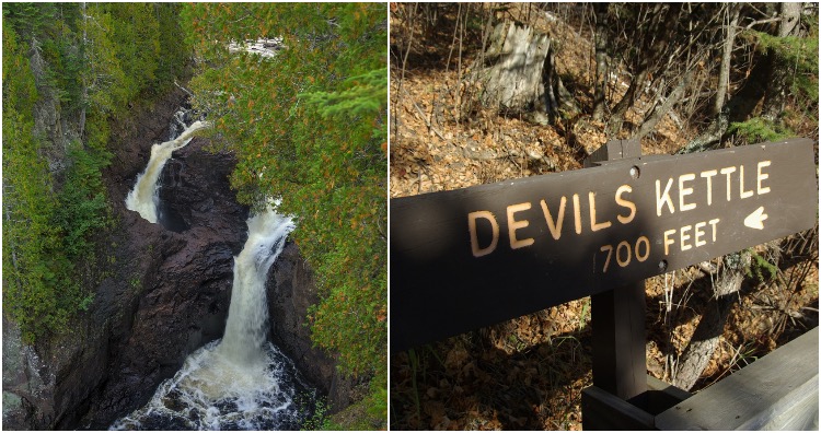About one and a half mile from the Lake Superior, the river forks into two streams at the Devilâs Kettle due to the presence of a protruding rhyolite. While the right part of the river flows down normally and joins the Lake Superior, the left part of the river falls into a giant pit. You can see the pit in the image above.