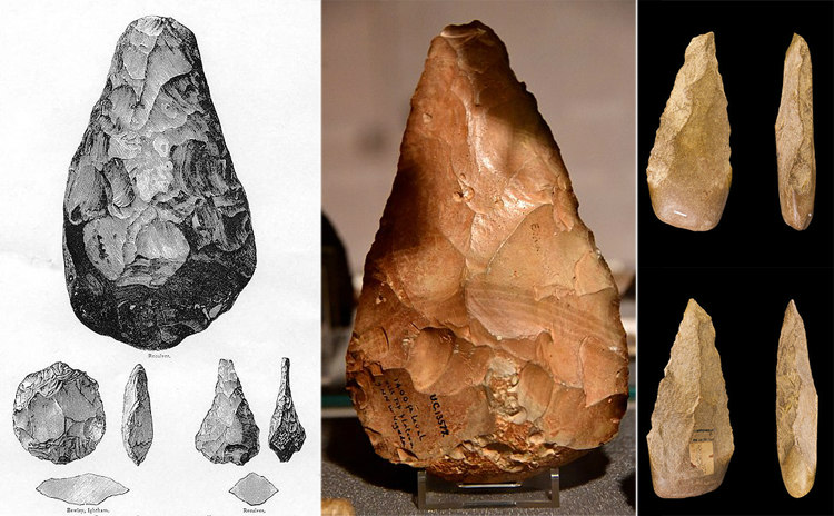 The flint tools such as blades, end scrapers, burins, and backed knifes found at the site suggest sophisticated toolmaking skills. The flint is believed to have been collected from the surface or dug from shallow quarries. Acheulean Handaxes. Image Source: wikipedia