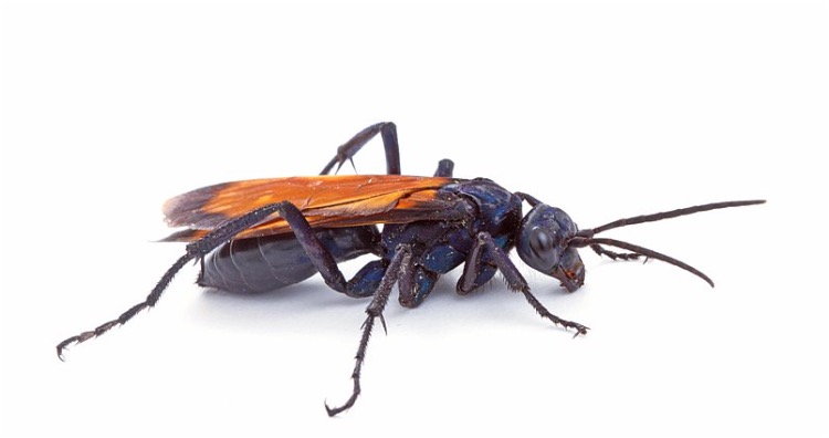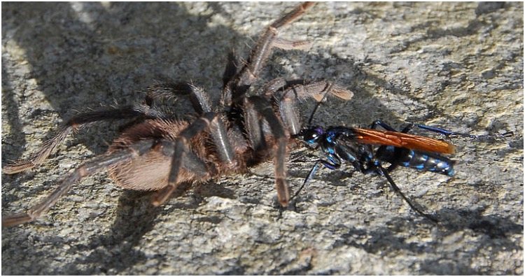 The tarantula hawk is a species of spider wasps that is famous for hunting down tarantulas. They are parasitoid wasps, and they use their sting to paralyze their prey which they feed upon later.