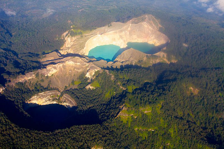 Kelimutu is famous for its three, summit, crater lakes which attract both tourists and geologists alike because of their varying colors despite being located atop the same volcano. The Three Lakes of Kelimutu From the Air. Image Source: Michael Day