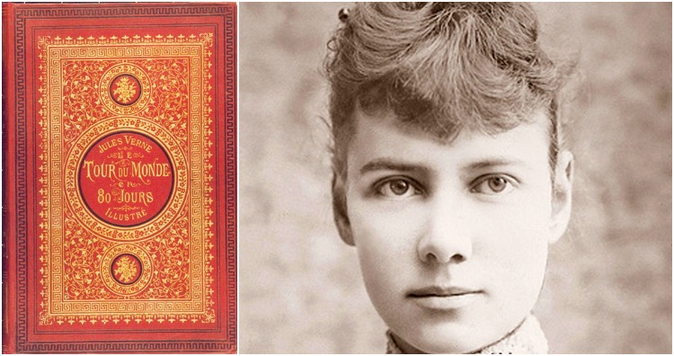 2 Inspired by Jules Verne’s Around The World in 80 Days, Nellie Bly was the first to attempt traveling around the world in 1889. She completed her journey in only 72 days and even met Jules Verne himself.Cover of the French first edition of Jules Verne’s Around the World in Eighty Days. Published on January 30, 1873/ Nellie Bly who traveled around the world in 72 days. Image Credit: Jules Verne via Wikipedia, H. J. Myers via Wikipedia