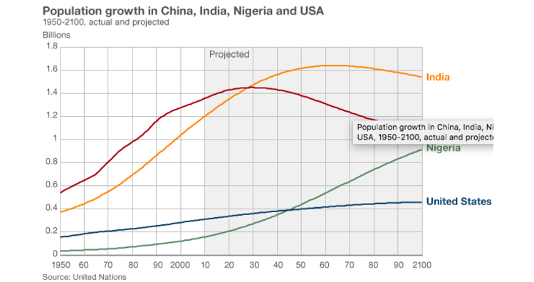 7 Only about 36% of people in India have Internet access. But even that 36% is more than the entire population of the US. Population growth in China, India, Nigeria, and the US. Image Credit: WRSC