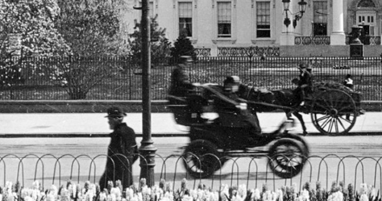 “Victoria” electric cab on Pennsylvania Ave., Washington City, seen from Lafayette Park in 1905. Image Credit: H.C. White via Wikipedia