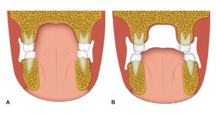 8 Your tongue rests on the roof of your mouth rather than the bottom. Proper tongue resting position. The tongue should rest on the roof of the mouth (A) and not on the bottom (B). Image Credit: Claiming Power