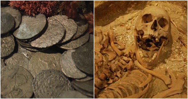 Rijksdaalder silver coins from the Batavia (1629) wreck displayed in Geraldton Museum/ One of the Batavia mutiny (1629) victims, excavated on Beacon Island and now displayed at Fremantle Shipwreck Museum. Image Credit: Wikipedia, Wikipedia