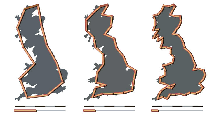 As the unit of measurement grows smaller the length of a coastline increases to infinity.Image Source: wikipedia