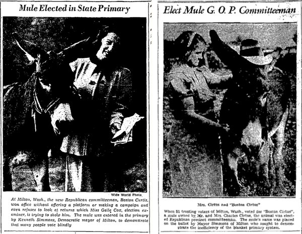 Imagine a brown mule walking into a courthouse to register as a candidate for an election and instead of putting his signature on the documents, he puts his hoofprint. Thatâs not out of an animated movie; that happened for real. Boston Curtis, also known as the âThe Milton Mule,â had 51 votes cast for him in the stateâs primary election that made him a Republic committee member. At the time of voting, the 51 people who voted for him had no idea that he was an animal!
