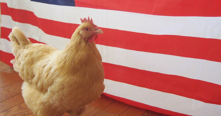 Poulet sold one of her eggs for 50 dollars at a fundraiser with actors Natalie Portman and Jason Alexander present at the event. She had her own spokeswoman named Charles Laws, an animal rights advocate, who told the media, âShe seemed so nonpolitical when I adopted her.â Laws found Poulet, an orange buff Orpington hen. on Craiglist in 2010. In 2012, the hen was aiming for the White House and had become an activist too for animal rights. (source)