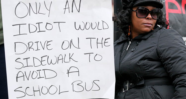 5 When a woman in Cleveland drove on the sidewalk to pass a school bus multiple times, a judge ordered her to stand with a sign that said, âOnly an idiot would drive on the sidewalk to avoid a school bus,â for two mornings.Image credits: Marvin Fong /The Plain Dealer /Landov via npr.org