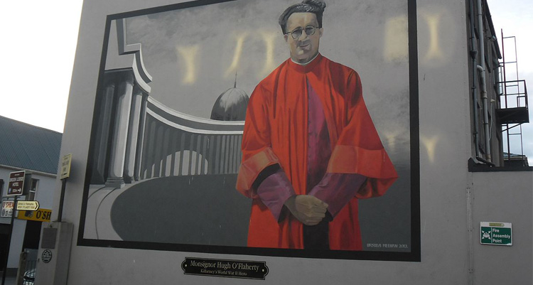 9 Hugh OâFlaherty, an Irish cleric and a master of disguise, saved about 6,500 Jews and POWs from the Nazis masquerading them as nuns and monks and hiding them in convents, farms, and homes.Mural of Monsignor Hugh O’Flaherty in Killarney, Ireland Image credits:: Dmol/wikipedia