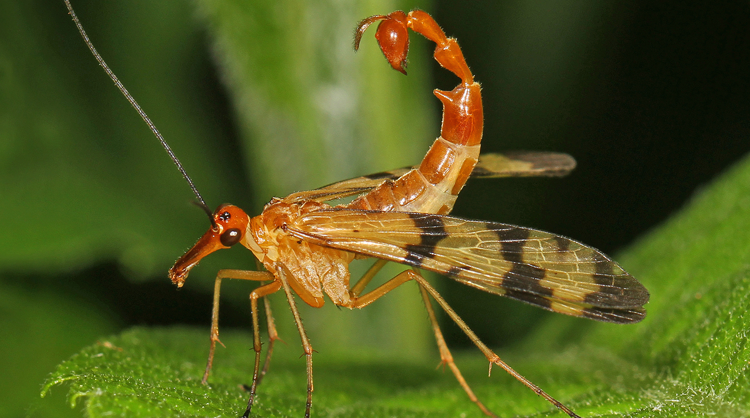 The way scorpionflies mate is very unique. The male scorpionfly hunts for an insect. It then tastes it, and if it finds the taste to be satisfactory, it will then hang it from a leaf of a twig inviting a female scorpionfly to eat the insect. While doing so, the male scorpionfly emits an odor which can be picked up by female scorpion flies from nearly 40 feet away. The female scorpionfly would then fly to the male, lower its wings, and eat the prey as a signal of acceptance. If the female does not like the prey, she would fly off. If she stays, they mate.