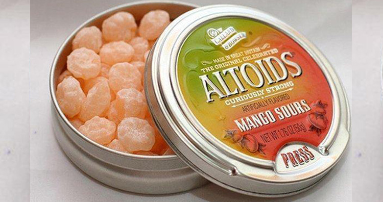 This crystalline candy with an incredibly sour taste was a hit in the early-2000s. Altoid mints were initially marketed to relieve stomach discomfort, but its unique taste made them a top-selling mint brand in the United States. The breath mints came in small, reusable, aluminum tins. The Altoid Sours were introduced in 2004 in a variety of flavors â raspberry, citrus, tangerine, apple, mango, and sorbitol. In addition to these flavors, the company released a limited edition passion fruit sours in 2005 just before Valentineâs Day.