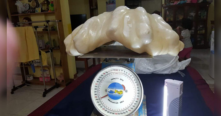 The fisherman had no idea that his discovery was worth millions. Motoring from Puerto Princesa on Palawan Island, the fisherman was on one of his daily trips to the sea when he was caught in a storm. The anchor of his boat got stuck on a giant clam. When he swam to free the anchor, he was surprised to find a large pearl inside the clam. The pearl is 30 cm wide (1ft), 67 cm long (2.2ft), and weighs 34 kg (75lb).