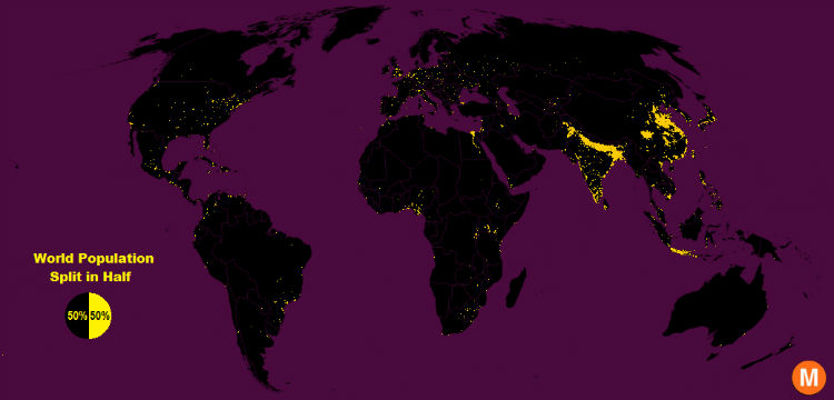 The grid used by Galka was comprised of 28 million cells, each measuring roughly three miles by three miles. The areas which had a population density of about 900 people for every square mile were colored in yellow, and the rest were in black. When Galka completed his black and yellow map, he noticed that the yellow portion was spread over only 1% of Earth’s land surface. This indicates that half of the total world population lives on only 1% of the land. Most of the yellow region is located in Asia, especially in India, Bangladesh, and China.