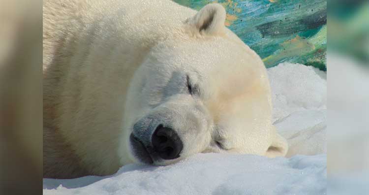 Polar bears love to sleep. They can sleep for seven to eight hours in one go. Sleep is very essential for polar bears as it helps them in conserving energy. They can sleep just about anywhere. Usually, polar bears choose a dry, comfortable spot with good visibility. If they are on soft ground, they dig shallow sleeping pits known as “day beds.” These day beds have been measured to be up to 0.5 meters in depth and 1.5 meters in diameter. While lying in the bed, they use their paw or a rock or a block of ice or snow as a pillow.