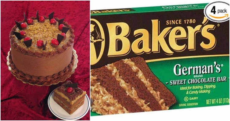 2 German chocolate cake is not actually German. It was named after Samuel German, an American, who developed the type of baking chocolate that is used in the cake.German chocolate cake/ Baker’s German’s Sweet Chocolate Bar. Image Credit: Wikipedia, Amazon