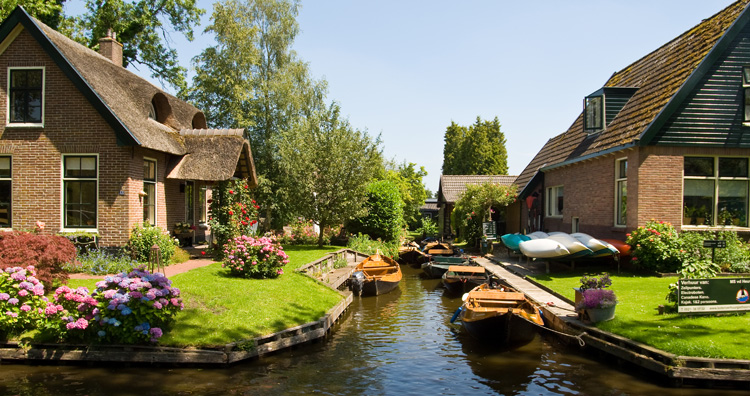 Giethoorn is a car-free village that is located in the northeastern Dutch province of Overijssel. The village has no roads. It is known for its boat-filled waterways, footpaths, bicycle trails, and thatched-roof houses. The scenic village and the places surrounding it are connected by beautiful canals or can be reached by foot over its wooden-arched bridges. The locals in the village use punters to navigate around the village.