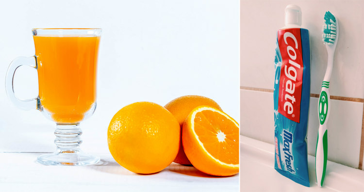 10 Orange juice tastes bad when you drink it right after brushing your teeth because of a foaming agent called sodium laurel sulfate which blocks your sweet receptors. Orange Juice and Toothpaste. Image Source: Marco Verch/Flickr, ALEX KOOL/Unsplash