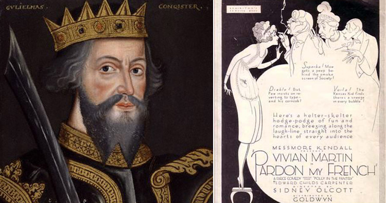 2 âPardon my Frenchâ was actually a way of hiding profanity by using swear words from the French language.(Image 1) King William I The Conqueror. (Image 2) Poster for the 1921 movie Pardon My French, the character of the left uses the French profanity “Diable !”. Image credits: National Portrait Gallery, Goldwyn Pictures/Wikipedia