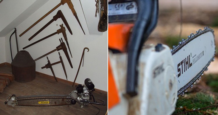 (Image 1) Typical of the earliest chainsaws. (Image 2) Electric Chainsaw. Image credits: Claus Ableiter/Wikipedia, Pixabay