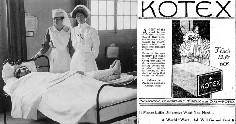 It was during World War I that Kimberly-Clark, a supplier of paper, invented a material from wood-processed pulp. “Cellucotton” was more absorbent than cotton and so was used as bandages during the war. After the war ended, the company was in need of a product that would use the leftover cellucotton from the war. They came up with an idea to use the material for creating sanitary napkins which werenât common during that time. In 1920, Kotex was born. Originally marketed as “Cellunap,” the name was finally changed to Kotex. (source)
