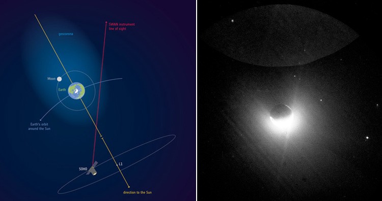 The presence of the geocorona was known to scientists since the Apollo 16’s mission in 1972, but they didn’t know that it was so vast. The neutral hydrogen density of the geocorona lies in the order of one, or less than one, atom per cubic centimeter at the moon’s distance. There are just 70 hydrogen atoms per cubic centimeter (0.06 cubic inches) at an altitude of 37,000 miles (60,000 km) on the day side. (1, 2, 3)